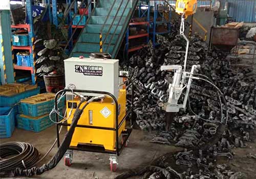 鑄件(jian)澆(jiao)冒口分離器工作原(yuan)理:工藝流程(cheng)是:油泵站(zhan)接(jie)380伏電源,油泵站和分離器通過2根高壓(ya)(ya)油管(一進一出)連接,分(fen)離器由平衡(heng)葫蘆(lu)吊懸掛方便(bian)操作。以下是工(gong)作原理(li)。鑄件澆冒(mao)口(kou)分(fen)離器通過液壓(ya)(ya)泵站產(chan)生18-70MPa液壓動力。開(kai)機時(shi),按下鑄件分(fen)離器手把開(kai)關(guan),油泵站(zhan)由(you)低壓泵送(song)油,當(dang)壓力達到18MPa,高(gao)(gao)低壓(ya)(ya)(ya)切換(huan)閥切斷(duan)低壓(ya)(ya)(ya)泵,這(zhe)時,由高(gao)(gao)壓(ya)(ya)(ya)柱塞泵工作送油(you),高(gao)(gao)壓(ya)(ya)(ya)柱塞泵產生大70Mpa工作(zuo)壓(ya)力(高低(di)壓(ya)切換(huan)原理就是低(di)壓(ya)泵快速(su)送大(da)量(liang)的油,而高壓(ya)柱塞泵是少量(liang)油產生(sheng)高壓(ya),大(da)程度防止大(da)量(liang)油進出(chu),防止油泵站升溫),油管內(nei)高壓(ya)油推動分(fen)(fen)(fen)離(li)器油缸內(nei)活塞,活塞推動前端尖鐵,尖鐵向(xiang)兩邊推動楔鐵,以上油壓(ya)一系(xi)列(lie)動作(zuo)產生(sheng)大(da)噸分(fen)(fen)(fen)離(li)張力,將鑄件澆(jiao)冒口(kou)分(fen)(fen)(fen)離(li)器從母體(ti)分(fen)(fen)(fen)離(li)下來。